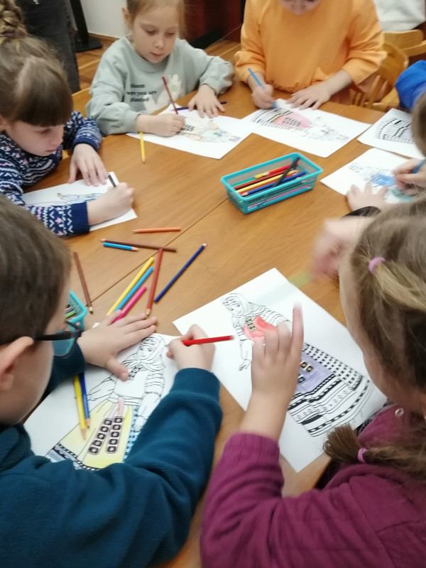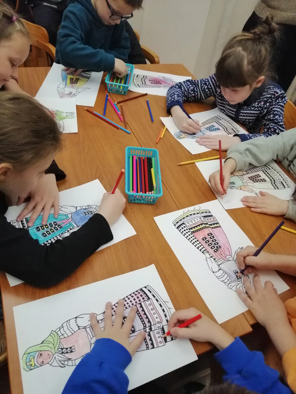 В завершение мероприятия дети увлеченно раскрашивали рисунок девушки в красивом русском наряде.