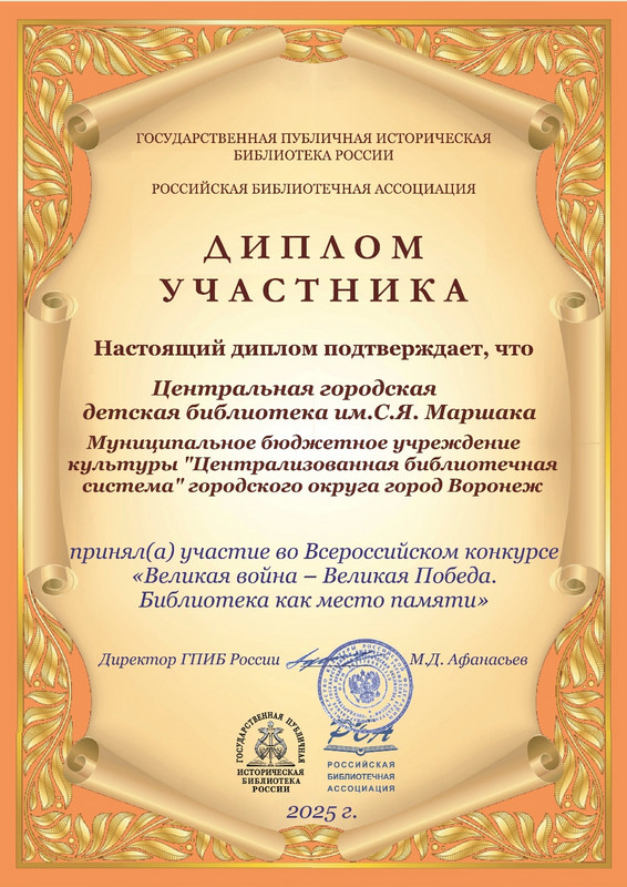 Наш Проект: «Дорогами памяти: Война. Воронеж. Победа». Это не просто название. Это – маршрут по страницам военной хроники, по улицам, носящим имена героев, по воспоминаниям с помощью книг, писем, документов. Наш Проект был удостоен Диплома за участие во Всероссийском конкурсе библиотечных Проектов «Великая война – Великая Победа. Библиотека как место памяти». Оценка нашего искреннего вклада в дело сохранения исторической правды это признание того, что библиотека сегодня – не просто хранилище книг. Это – живой, пульсирующий нерв города, современное «место памяти», где прошлое встречается с будущим, чтобы уроки истории навсегда остались в умах и сердцах новых поколений, на укрепление связи поколений через литературу, творчество и живое общение. Это подтверждает эффективность выбранных методов и вклад библиотеки в сохранение исторической памяти о Великой Отечественной войне и о героических событиях нашего региона.