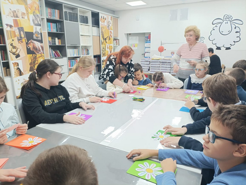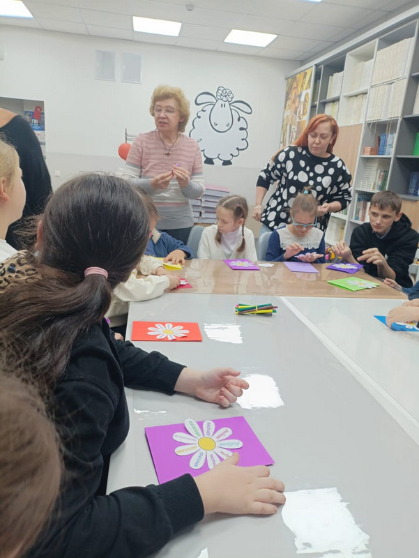 Все вместе, дружно изготовили красочные открытки для любимых мамочек с теплыми пожеланиями.
