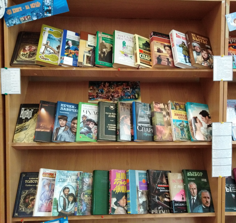 «Из книги – на экран» - так называется первая рубрика книжной выставки, на которой представлены знаменитые книги отечественных и зарубежных авторов, по которым были сняты замечательные фильмы. После их просмотра хочется перечитать первоисточник. Среди представленных книг: М. Булгаков «Мастер и Маргарита»; Ф. Достоевский «Идиот»; Г. Уэльс «Человек-невидимка»; Н. Спаркс «Спеши любить»; В Каверин «Два капитана» и др.