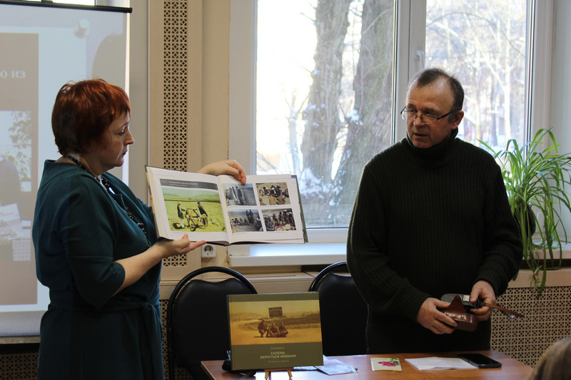 Автор книги Виктор Руденко - много лет возглавлял воронежскую областную газету "Коммуна", автор книги памяти "Прощай, шурави", документальных книг «Особая миссия» и «Саперы. Вернуться живыми». В настоящее время является главным редактором корпоративной газеты Нововоронежской АЭС "Рабочий атом". В 1985-1987 годах, после окончания 1 курса факультета журналистики ВГУ, проходил срочную службу в составе ограниченного контингента войск в Афганистане. Служил в инженерно-саперной роте 191-го отдельного мотострелкового полка. Беседу сопровождали вещи, которые встречаются на фото из альбома - поздравительные открытки (в которых, с предосторожностями и отправлялся отснятый и проявленный материал), нарды (хотя автор так и не научился в них играть, но ребята всегда играли в минуты отдыха), гитара, гильзы от пуль. Виктор Руденко делился своими воспоминаниями, представлял главы из альбома - "Запомните нас такими" и "Черно-белое кино из Афгана", комментировал некоторые фото. Он предложил присутствующим школьникам ряд заповедей, уроков. Среди них такие - солдатом можно стать неожиданно для себя, навыки выживания на войне ценятся прежде всего; спокойствие, многое на войне от тебя не зависит; берегите близких, помните о погибших, на их месте могли быть и вы, сохраняйте память о войне; у каждого своя правда о войне.