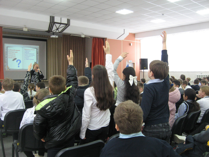 Ребятам рассказывают о памятных датах, когда принято чествовать защитников Родины. Эту тему продолжает информативная презентация, которая подробно знакомит аудиторию с подвигами воронежцев. Ведущие вместе с учащимися совершают виртуальную экскурсию по улицам, паркам и скверам Воронежа, которые названы в честь героев Отечества. Все ребята активно принимают участие в краеведческой викторине.