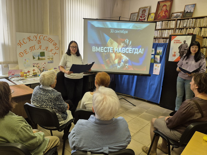 С помощью презентации гости мероприятия совершили краткий экскурс в историю и вспомнили о значимых событиях, связанных с вхождением новых регионов в состав Российской Федерации, а также поучавствовали в историко-литературной викторину «Что вы знаете о новых регионах России?». На протяжении всего мероприятия звучали стихи и песни о мужестве и силе человеческого духа: «За Победу, за Россию, за Донбасс! », «С Россией в сердце», «Русский Донбасс».