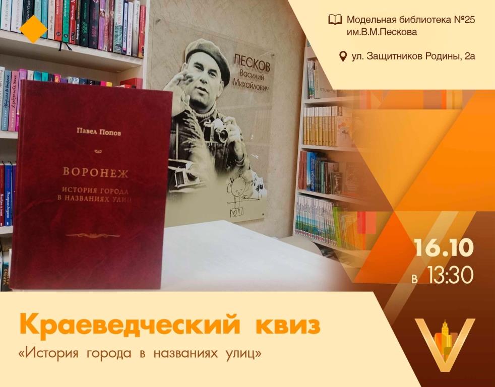 Теги: модельная библиотека, форум2025, ф.2516 октября 2025 г. в 13.30 модельная библиотека № 25 им. В.М. Пескова для учащихся школы-партера проведет краеведческий квест «История города в названиях улиц» 12+. Квест включает задания по улицам, легендам, достопримечательностям, известным личностям, культурным достижениям Воронежа. Вспомним мы и героическое прошлое нашего города. В ходе мероприятия участники смогут проверить свои знания, узнать что-то новое и интересно провести время.
