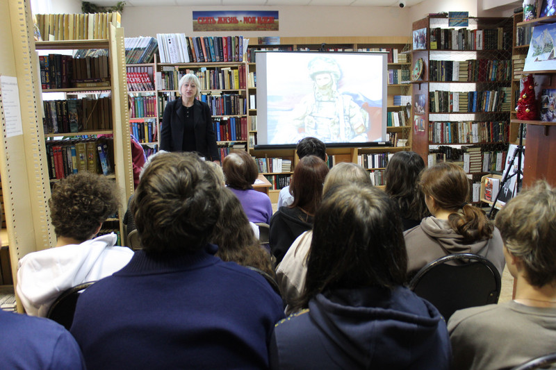 К встрече была подготовлена книжно-иллюстративная выставка "Победа будет за нами!". Ещё Валентина Николаевна рассказала о своей волонтерской деятельности в команде общественной организации "Служу России. Зов", отделение "Золушки"; школьникам была представлена маскировочная сеть и показаны азы её плетения.