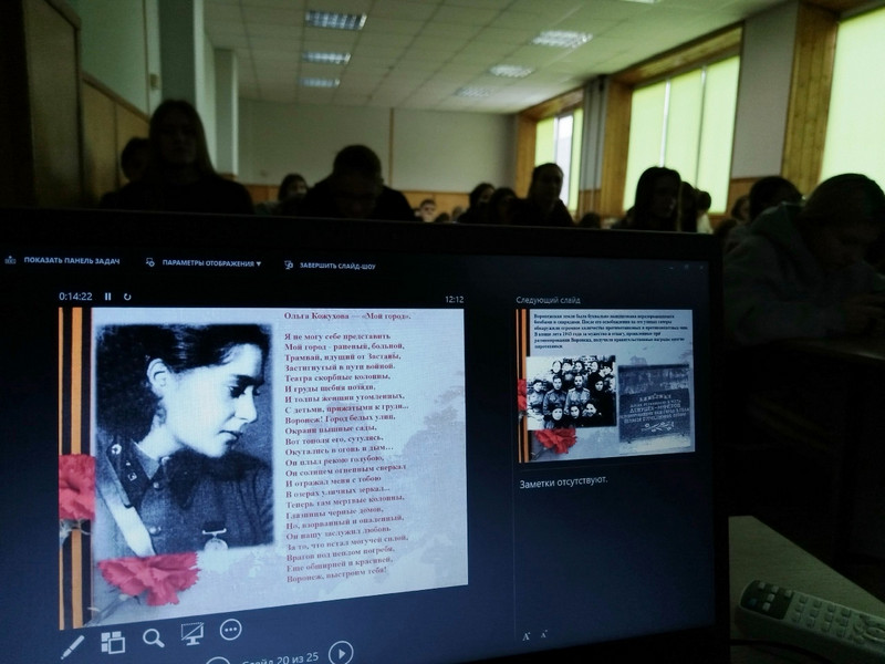 Теги: ф.129 января сотрудники библиотеки №1 подготовили и провели для студентов Воронежского государственного лесотехнического университета имени Г. Ф. Морозова патриотический вечер «Восставший из руин». Это мероприятие было приурочено к двум ключевым датам, сыгравшим важнейшую роль в победе советского народа в Великой Отечественной войне: освобождению города Воронежа и полному снятию блокады Ленинграда.