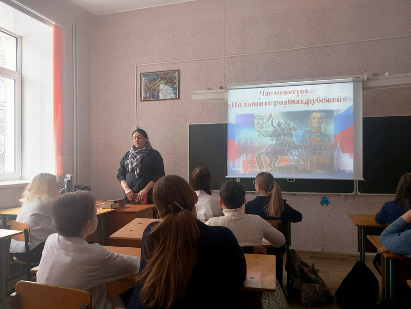 К Дню защитника Отечества сотрудниками библиотеки №1 был подготовлен час мужества «На защите родных рубежей». В самом начале мероприятия библиотекарь рассказала школьникам, почему именно 23 февраля поздравляют всех тех, кто охраняет покой нашей огромной страны. Для участников мероприятия совершили небольшой экскурс в историю праздника, напомнили имена героев нашей отчизны, начиная с Древней Руси, заканчивая нашим временем, рассказали о традициях празднования. Ребята также узнали, что не только мужчины стоят на страже нашей Родины, но и женщины. Школьники прослушали рассказ о выдающихся военачальниках, познакомились с патриотической прозой известных российских писателей, где описаны исторические и военные события, подвиги, как простых солдат, так и выдающихся полководцев и адмиралов. Школьники узнали много интересных фактов о М.И. Кутузове, А.В. Суворове, Ф. Ушакове, маршале Г. Жукове. Рассказ сопровождался демонстрацией электронной презентации.
