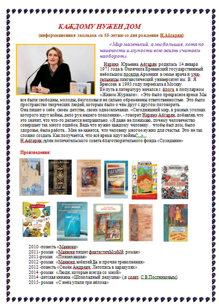 Год писательских юбилеев в 2026 мы открываем информационной закладкой к 55- летию со дня рождения нашей современницы- писателя- Наринэ Абгарян- «Каждому нужен дом».