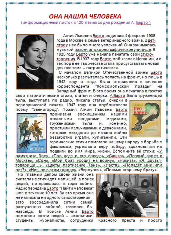 В юбилейный для А.Барто год предлагаем информационный листок «Она нашла человека»- о теме Великой Отечественной войны в творчестве писательницы и работе в послевоенные годы.