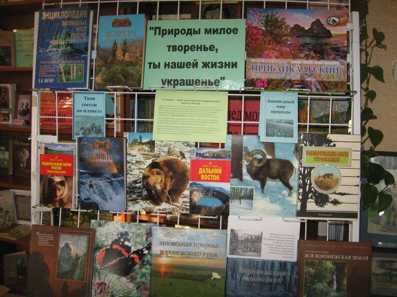 На книжной выставке была представлена подборка иллюстрированных изданий о заповедных местах России, художественная литература о природе и тематические фотографии читателей библиотеки.