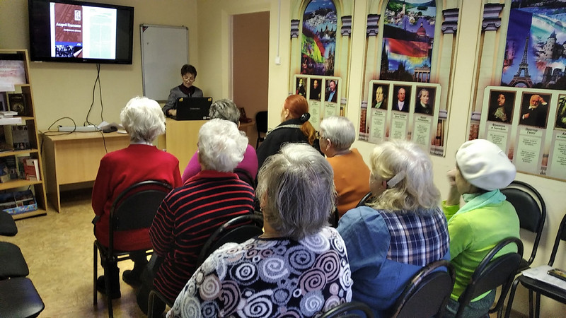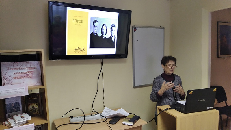 13 января в библиотеке №26 состоялось очередное заседание клуба «Живое общение». Для участников клуба сотрудники библиотеки провели литературный час «Творческое наследие Андрея Платонова». Ведущая познакомила с жизнью и творчеством Андрея Платонова. Была представлена презентация самых известных произведений писателя. Зачитывались отрывки из книги «Котлован», «Епифанские шлюзы», «Впрок». Читатели узнали много нового и интересного о жизни и творчестве такого сложного и замечательного писателя. Платонов оказал огромное влияние на русскую литературу, а его книги в настоящее время вызывают споры и размышления о смысле жизни, власти и человеческой судьбе.
