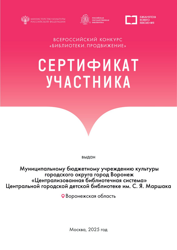 Теги: ЦГДБЦентральная детская библиотека им. С.Я. Маршака вышла на Всероссийский уровень! Мы приняли участие в престижном конкурсе «Библиотеки. ПРОдвижение 2025», который был объявлен Федеральным государственным учреждением «Российская государственная библиотека» (г. Москва).