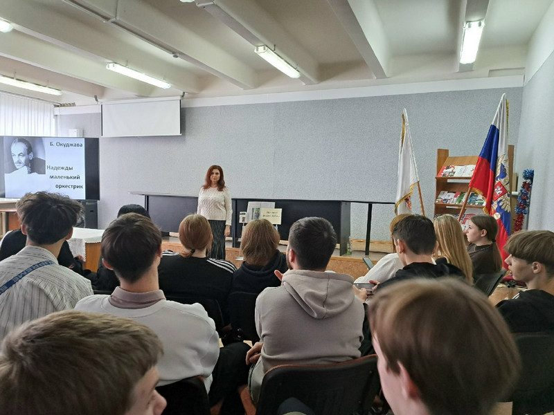 На мероприятии были обозначены основные вехи жизни и творчества Булата Окуджавы, который писал и пел о Великой Отечественной войне, о любви к Родине, к друзьям, к родному дому и двору. Ведущая встречи познакомила с книжной выставкой, подготовленной к мероприятию, и напомнила, что песни Б.Окуджавы ознаменовали собой целую эпоху, и сегодня они не потеряли своей остроты и актуальности.
