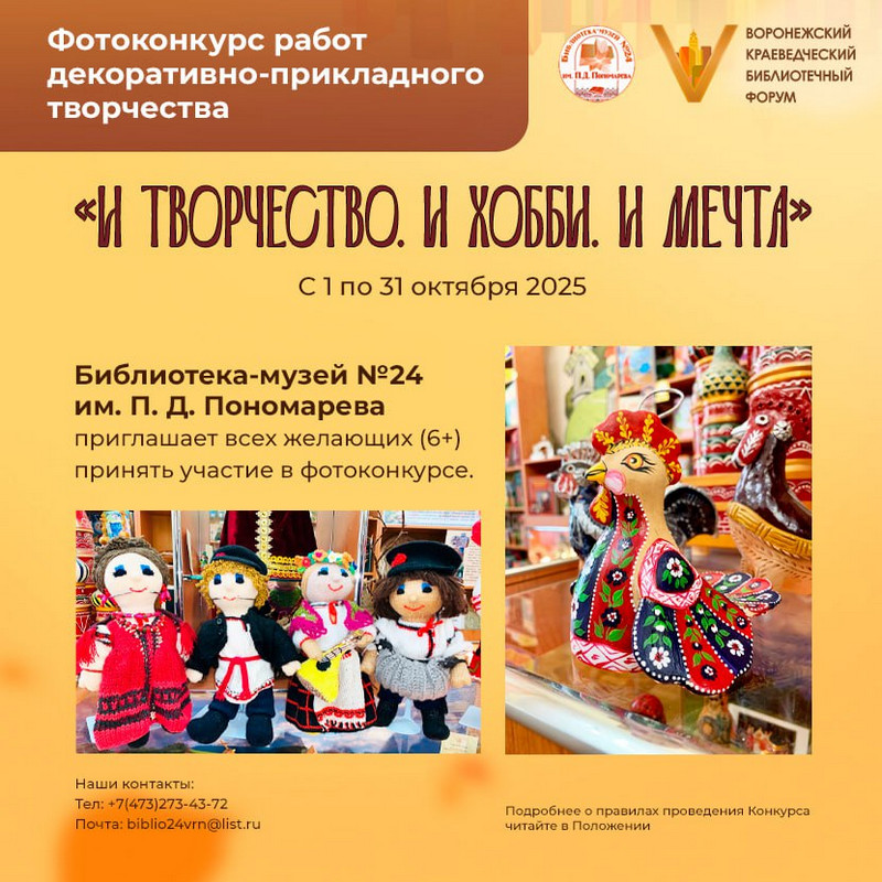Библиотека-музей №24 им. П.Д. Пономарева благодарит всех участников конкурса «И творчество, и хобби, и мечта» прошедшего 2024 года и приглашает вновь стать конкурсантами Воронежского краеведческого библиотечного Форума.