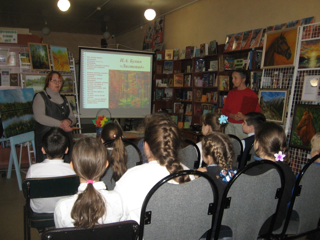 Слушая стихи поэта «Листопад», «Осыпаются астры в садах», «Осень. Чаща леса» дети определяли цвета бунинской осени. Получив кленовые, дубовые, берёзовые листики-раскраски мальчики и девочки приступили к созданию своего «бунинского букета». Библиотекари рассказали им интересные факты биографии И.А. Бунина, прочли его стихи «Детство», «Матери», «Лунная ночь» и другие.