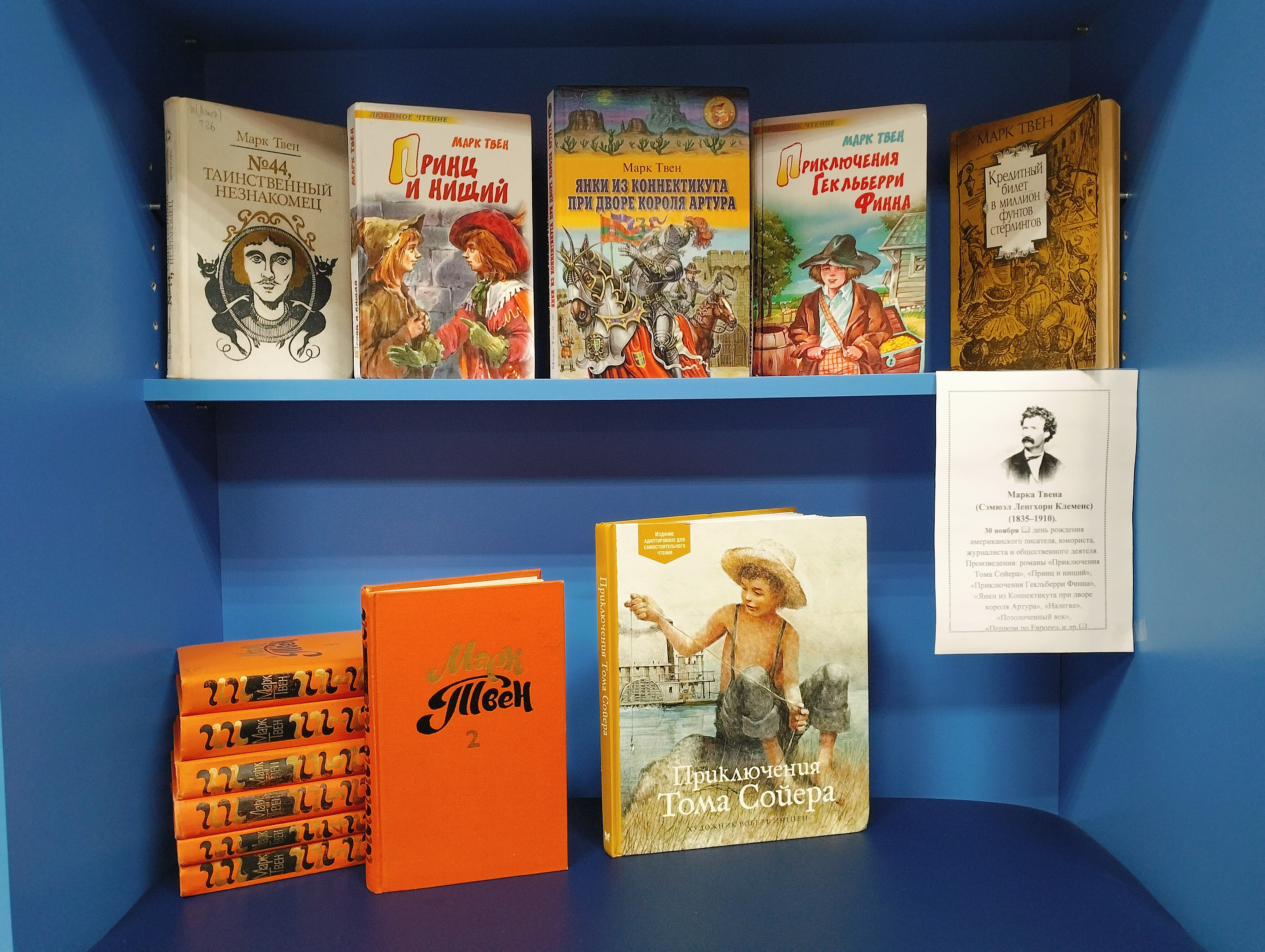 Выставка книг на детском отделении посвящена знаменитому американскому писателю Сэмюэлу Ленгхорну Клеменсу, известного всему миру под псевдонимом Марк Твен. Том Сойер, Гекльберри Финн, Бекки Тэтчер, Джим – эти имена знакомы каждому с детства. Марк Твен обладал удивительной способностью сохранять в себе детскую непосредственность и любопытство. Он показывает, как важно не терять эту способность с возрастом, как важно уметь удивляться миру и видеть его во всей его красе.