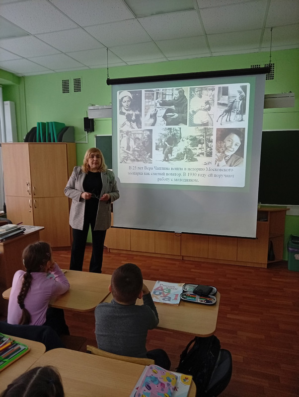 Ведущая мероприятия рассказала ребятам о том, что Вера Чаплина более тридцати лет проработала в Московском зоопарке, где ухаживала за животными и занималась исследовательской деятельностью. Порой ей приходилось выкармливать малышей самых разных животных, которые по разным причинам остались без мамы.