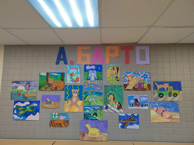 Затем ребята читали стихи поэтессы: «Идет бычок качается…», «Наша Таня громко плачет», «Уронили мишку на пол», стена в зале была оформлена рисунками ребят по произведениям писательницы. Ведущая познакомила с выставкой "Стихи, знакомые с детства»".