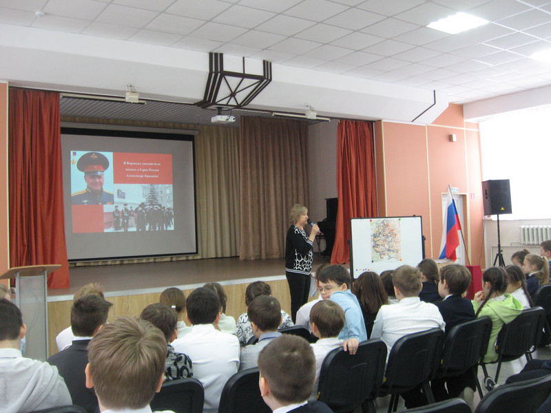 Ребятам рассказывают о памятных датах, когда принято чествовать защитников Родины. Эту тему продолжает информативная презентация, которая подробно знакомит аудиторию с подвигами воронежцев. Ведущие вместе с учащимися совершают виртуальную экскурсию по улицам, паркам и скверам Воронежа, которые названы в честь героев Отечества. Все ребята активно принимают участие в краеведческой викторине.