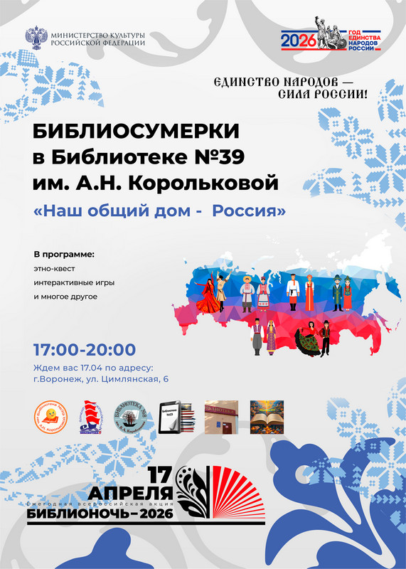 17 апреля, с 17:00 до 20:00, библиотека №39 имени А.Н. Корольковой присоединится к Всероссийской акции «Библионочь-2026: Единство народов – сила России», проведя мероприятие под названием «Библиосумерки: Наш общий дом – Россия».