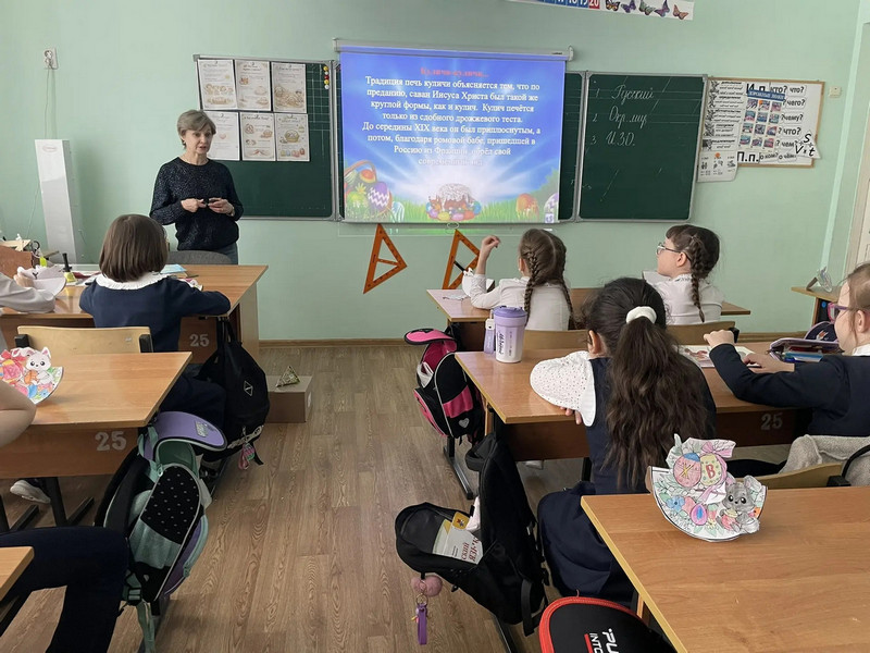 В преддверии Пасхи для учеников начальных классов был проведён познавательный час «Пасхальное Воскресение». Дети узнали, как возник этот праздник, почему он так называется, познакомились с пасхальными традициями. Они отвечали на вопросы пасхальной викторины, участвовали в конкурсах и приняли участие в изготовлении пасхальной аппликации.