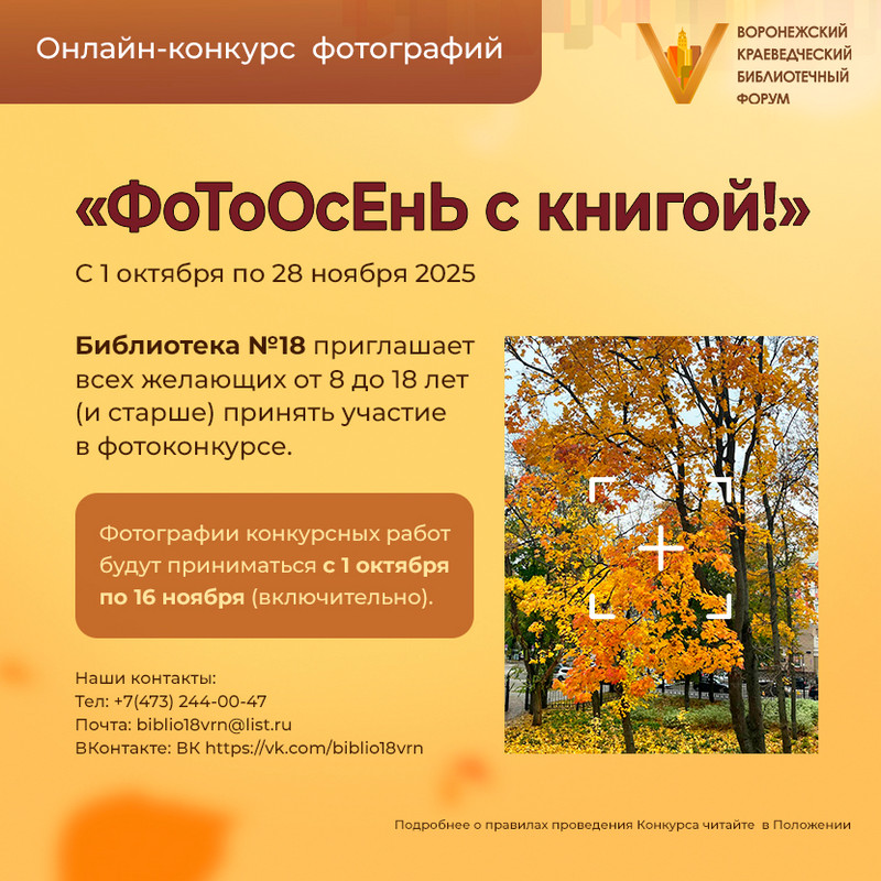 С 1 октября по 28 ноября 2025 года Библиотека №18 приглашает всех желающих от 8 до 18 лет (и старше) принять участие в онлайн- конкурсе фотографий «ФоТоОсЕнЬ с книгой!